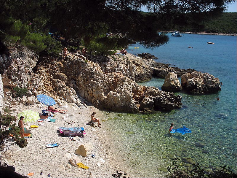 Camping Slatina, auf Cres Anfang August. Der Platz ist fast voll. Gut, einsam ist man nicht, aber sein Handtuch muß man auch nicht morgens rauslegen.